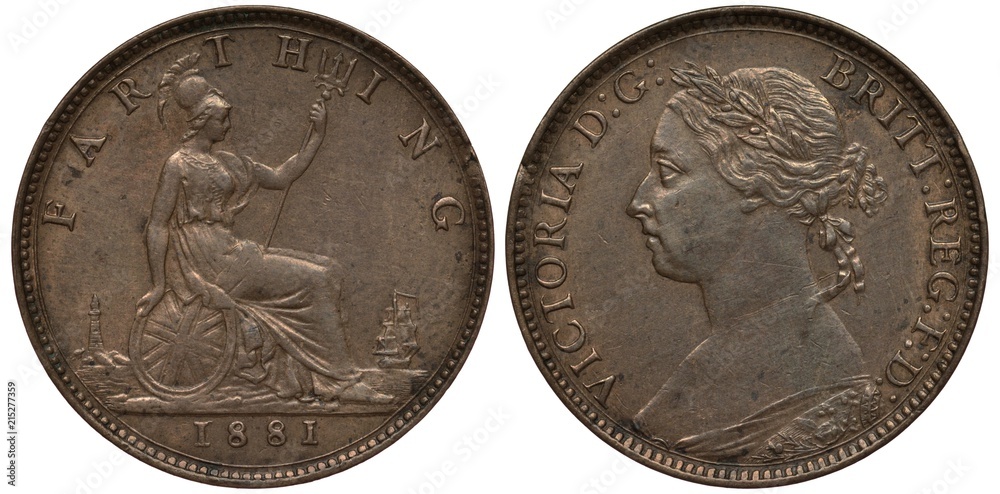 United Kingdom British coin 1 one farthing 1881, seating Britannia with oval shield and trident, lighthouse to the left, sailing ship at right, bust of Queen Victoria left,