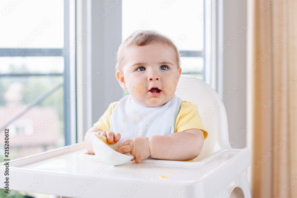 Portrait of cute adorable Caucasian child boy with dirty messy face sitting in high chair eating apple puree with fingers. Everyday home childhood lifestyle. Infant trying supplementary baby food