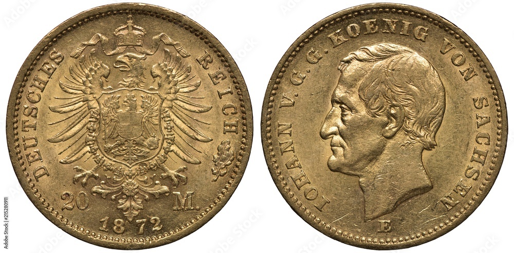 Germany German Saxony golden coin 20 twenty mark 1872, eagle of first type with shield with eagle on chest surrounded by collar of the order, crown with ribbon above, date below, head of King Iohann V