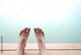 woman foot on wood floor with blue lake water in summer vacation background