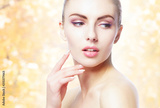 Portrait of young, natural and healthy woman over yellow autumn background.