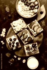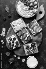 Fresh breakfast - corn flakes with milk and berries, homemade waffles with fruit on a dark background. The view from above, flat lay.