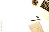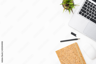 White photographer desk with laptop computer and office supplies. Top view, flat lay.