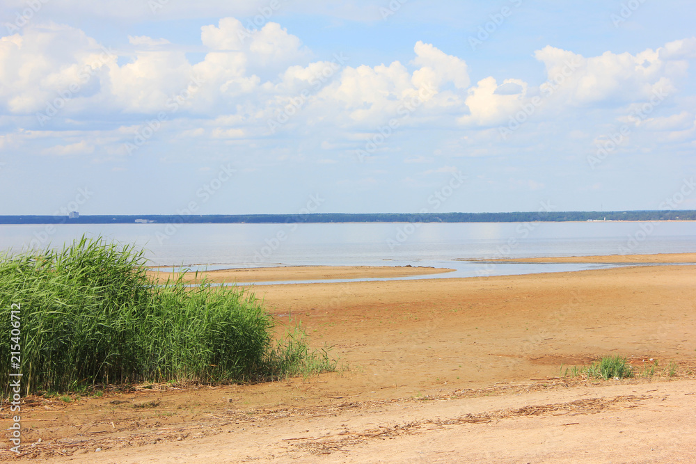 Baltic Sea Shore with Empty Sandy Beach in St. Petersburg, Russia. Summer Nature Landscape with Empty Beach and Calm Water Surface with No People on Bright Sunny Day.
