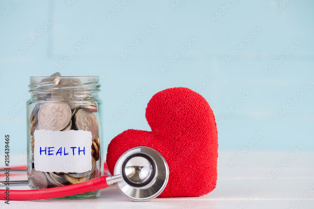 Money saving and health care concept. A jar contains coins with stethoscope and handmade red heart on white and pastel green wooden background.