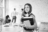 Portrait of female student holding books in classroom. Young woman looking at camera and smiling