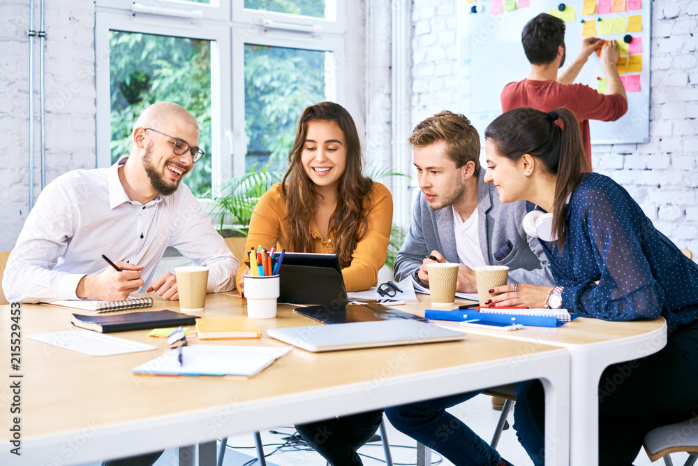 Group of students looking at tablet while studying together in university. Young creative workers brainstorming during meeting