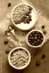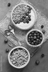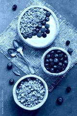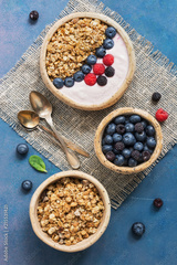 Bowl of homemade granola with yogurt and fresh berries on blue rustic background. Overhead, top view, flat lay