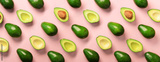 Avocado pattern on pink background. Top view. Banner. Pop art design, creative summer food concept. Green avocadoes, minimal flat lay style. Banner