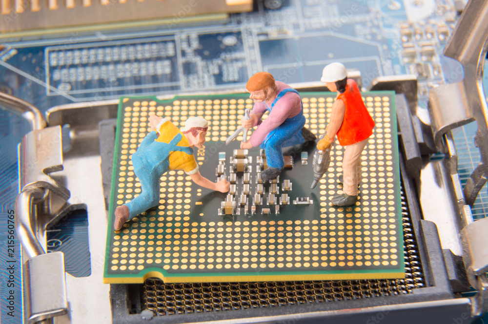 Miniature engineers or technician workers repairing CPU on the motherboard. Computer service and technology concept.