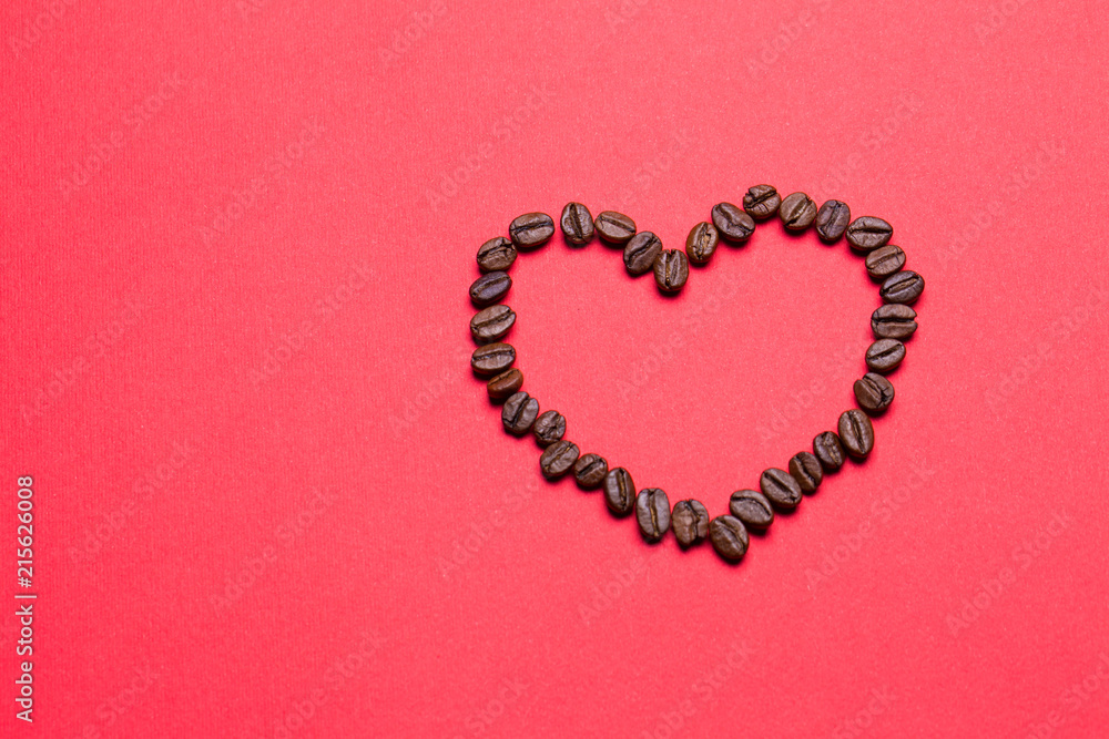Grains of coffee in the form of heart on a red background
