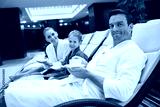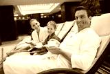 Waist up portrait of delighted man and woman sitting on deckchairs with kid. They are holding cups with hot drink to get warm after hydrotherapy in spa