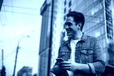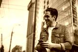 Side view of smiling male standing and holding smartphone in hands. He is writing message while waiting for girlfriend with pleasure. Copy space in left side