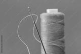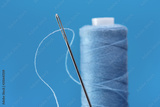 Large silver needle for sewing with thread. Vertically standing coil of blue threads. Blue background, copy space.
