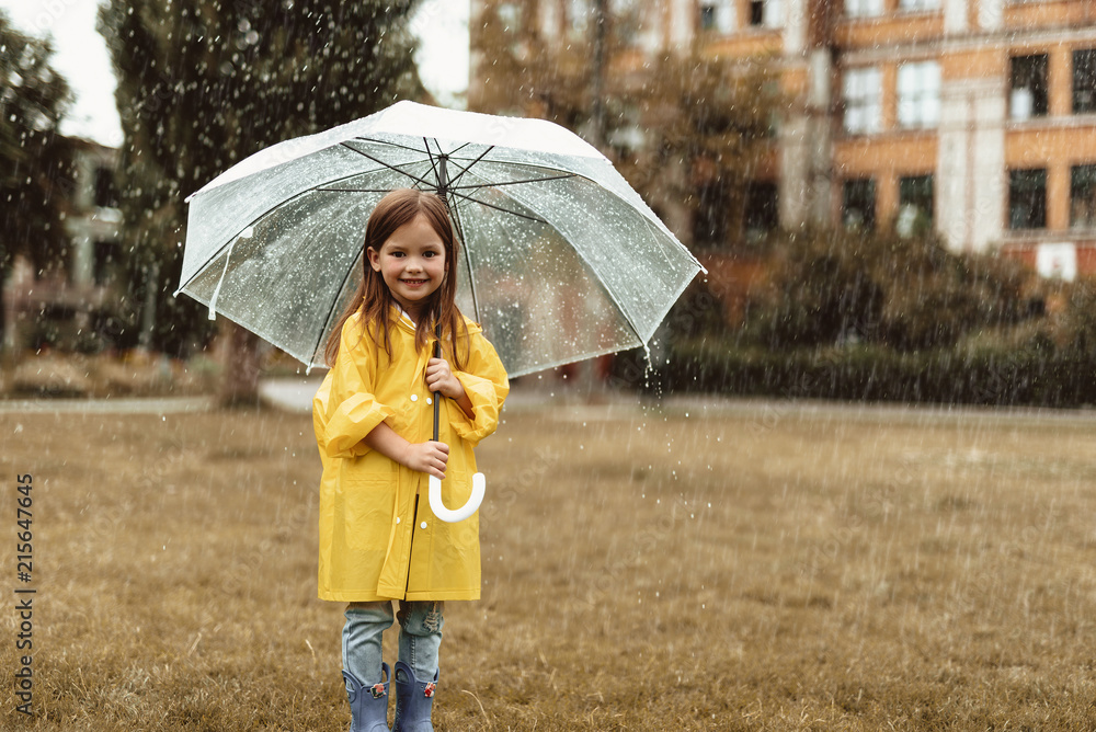 Full length portrait of smiling child walking on grass with umbrella in hands. She is looking with delight enjoying weather outside