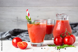 Tomato juice with fresh tomatoes, parsley, sea salt and pepper on light grey background. Vegetable drink.