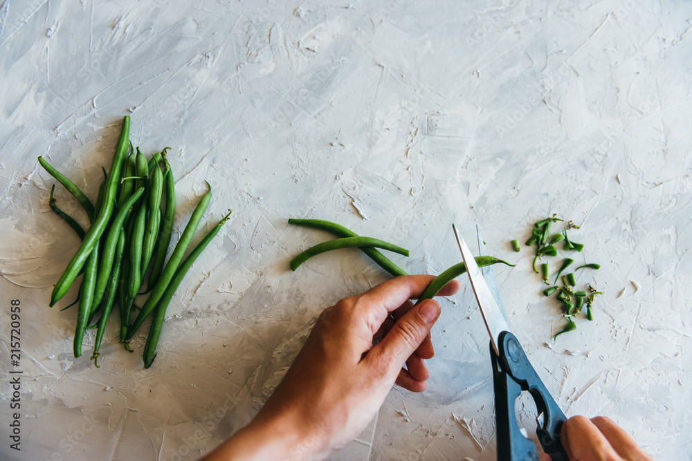 Green Beans on a grey concrete background wooden board cutting with scissors