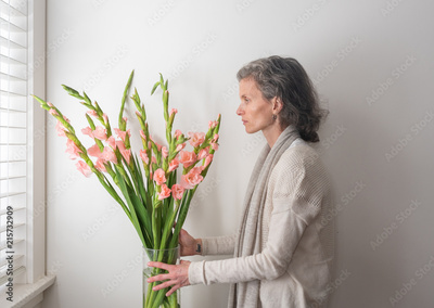 Middle aged woman with grey hair arranging pink gladioli in vase next to window (selective focus)