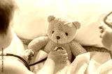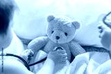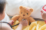 Cute little girl is playing doctor with stethoscope and teddy bear. Kid and health care concept.