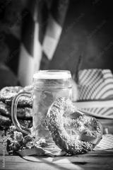 Beer mugs and pretzels on a wooden table. Oktoberfest. Beer festival.