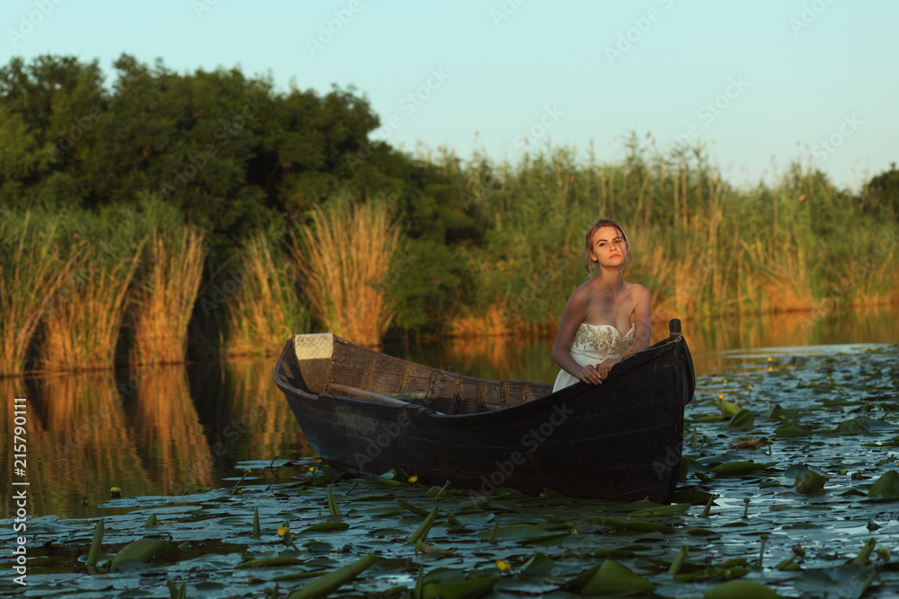 Beautiful young woman with elegant evening white dress resting in boat at sunset. Beautiful woman in authentic fishing boat.