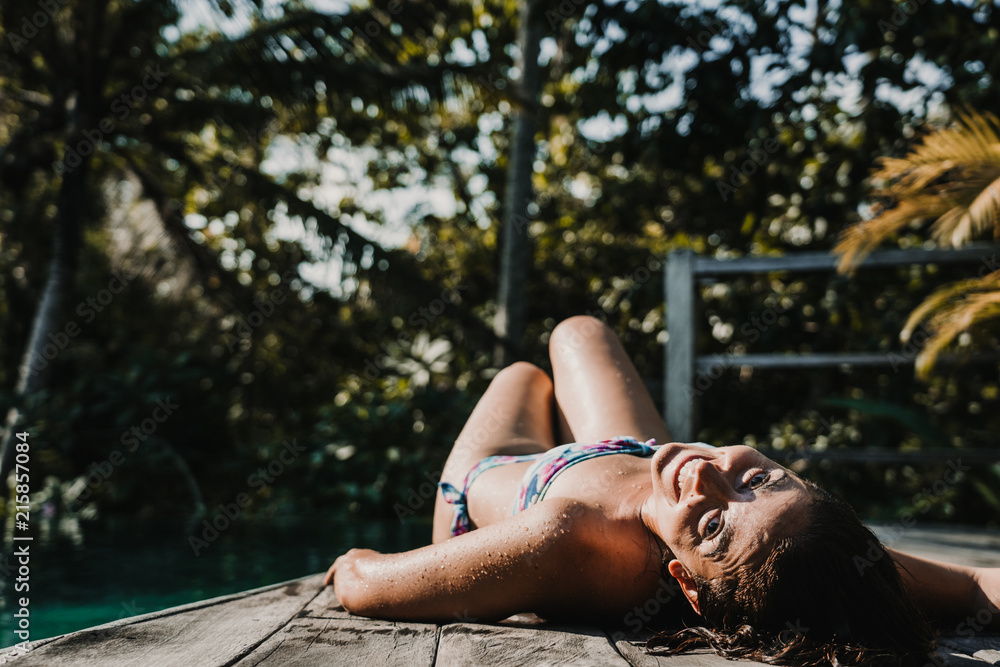 .Young and pretty woman enjoying her vacation in Ubud, in the Bali island, Indonesia. A summer afternoon in the pool with a tropical background. Relaxed and happy attitude. Lifestyle.