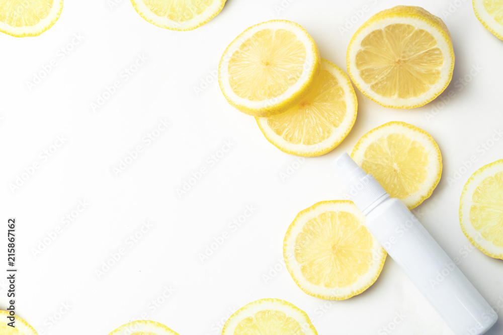 skincare spray cosmetic mockup with lemon fruit extract on white background top view