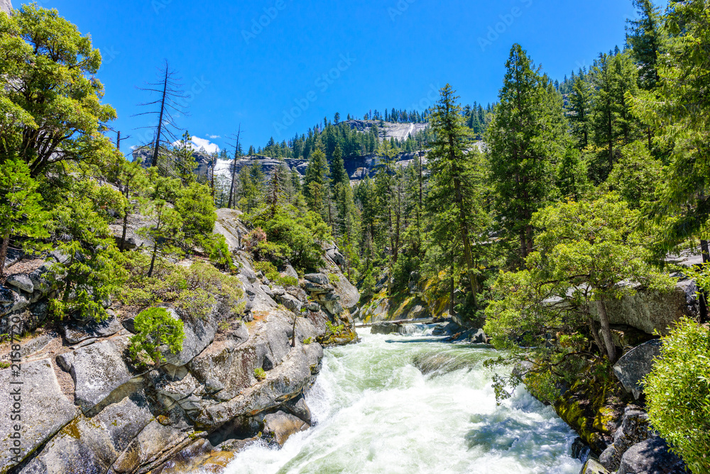 Merced River landscape in Yosemite National Park. Whitewater Rapids. California, USA.