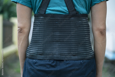 worker woman wearing back support for protect her back, medicine and healthy concept
