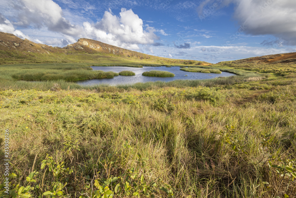 Rano Raraku Crater Volcano, just a view over the crater lake, an amazing landscape with its vegetation, trees, water and wonderful sky