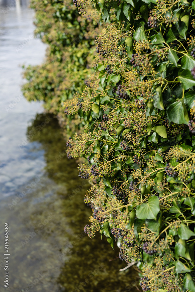green hedge close up with lake water