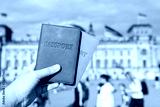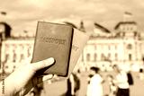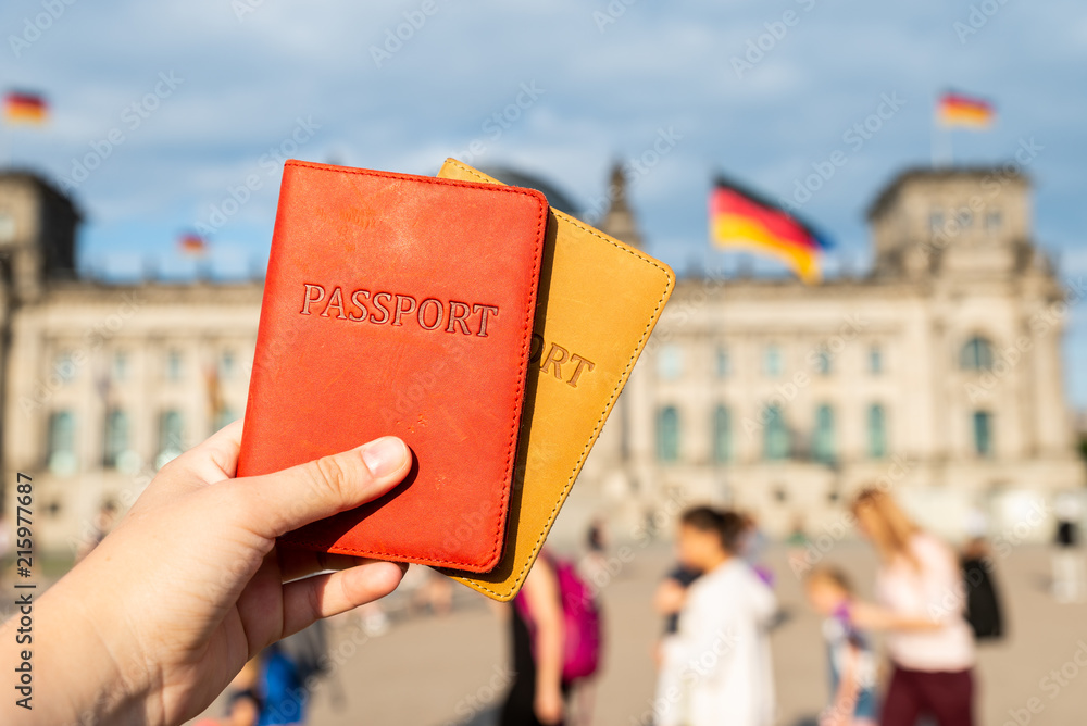 Berlin, Germany / June 28 of 2018: Two passports in yellow and red leather cases holding in hands on Reichstag building with flags in Berlin. Traveler showing id at camera in popular Germanys place.