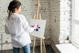 Portrait of beautiful brunette girl wearing in white shirt and jeans, drawing picture with oil paints. Smiling, pretty woman, young female artist dreaming about art and holding brush and palette.