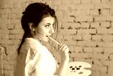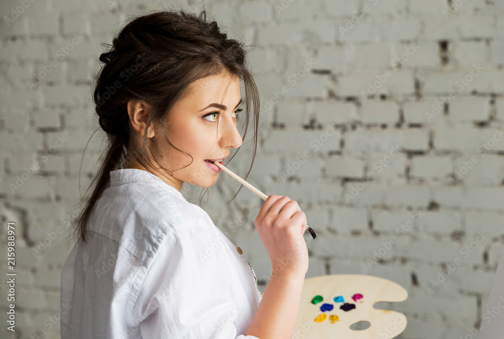 Portrait of beautiful brunette girl wearing in white shirt and jeans, drawing picture with oil paints. Smiling, pretty woman, young female artist dreaming about art and holding brush and palette.