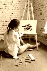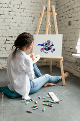 Back view of beautiful brunette girl in white shirt and jeans, sitting at work place and creating, drawing picture with oil colorful paints. Pretty woman, female artist holding brush and palette.