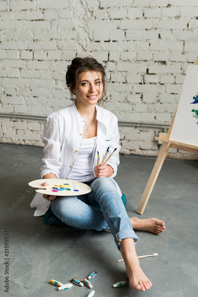 Beautiful brunette girl in white shirt and jeans, sitting at work place and creating, drawing picture with oil colorful paints. Pretty woman, female artist holding brush and palette and smiling.