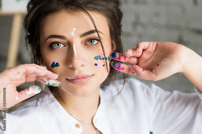 Sensuality female artist, with dirty hands after drawing picture with oil colorful paints. Beautiful brunette girl in white shirt and jeans after work touching face and looking at camera.