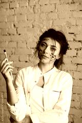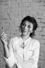 Beautiful and sensuality female artist, with dirty hands and face after drawing picture with oil colorful paints. Beautiful brunette girl in white shirt and jeans after work posing in studio.