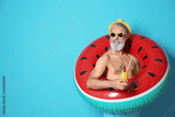 Shirtless man with inflatable ring and glass of cocktail on color background