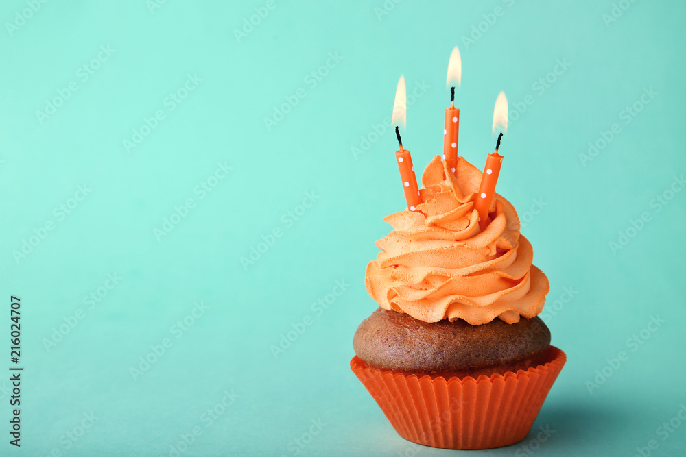 Tasty cupcake with candles on a mint background