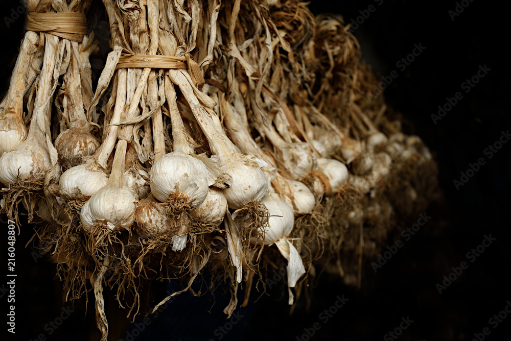 Bunch of white garlic on black background.
