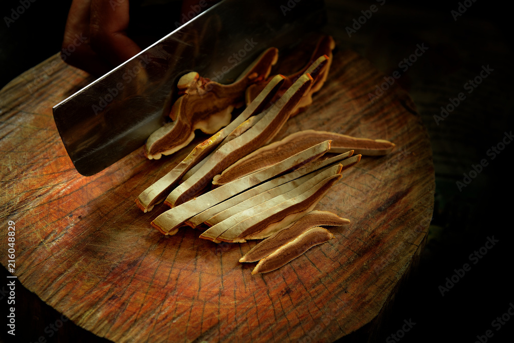 Ganoderma lucidum (Lingzhi mushroom) is cut into slices by using sharp knife.