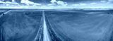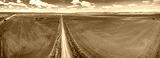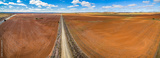 Road vanishing into the horizon between plowed fields in Australian countryside - aerial panorama