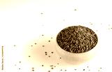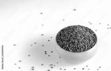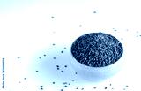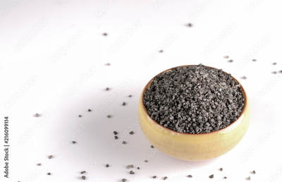 Himalayan black rock salt used in South Asia, the Himalayas, Pakistan in a stone bowl on a white background