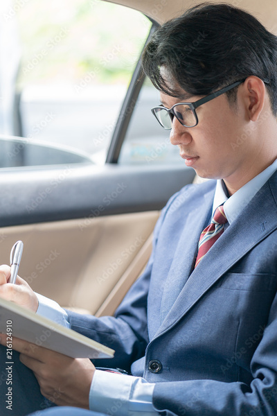 Businessman working in the backseat of a car