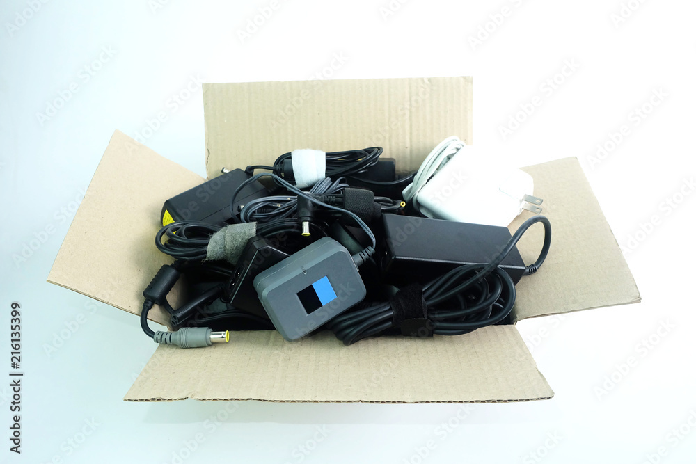 Paper box with the damaged or old used Adapter power charger of laptop computer on white background