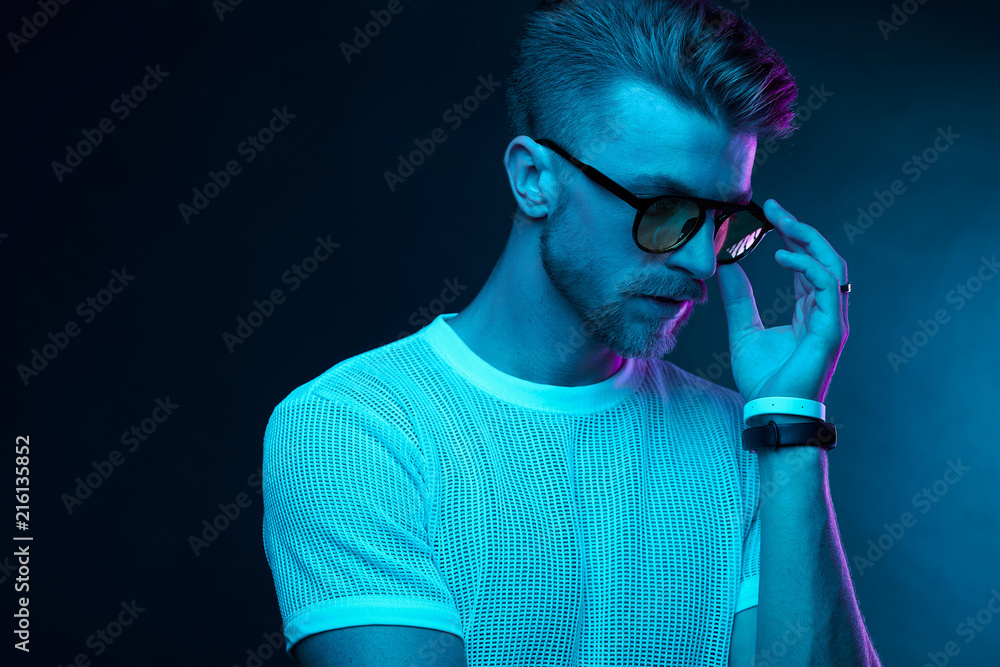 Neon light studio portrait of attractive male model with mustaches and beard in sunglasses and white t-shirt