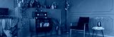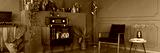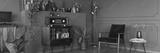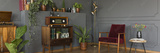 Radio on wooden cabinet in retro grey living room interior with plants and red armchair. Real photo