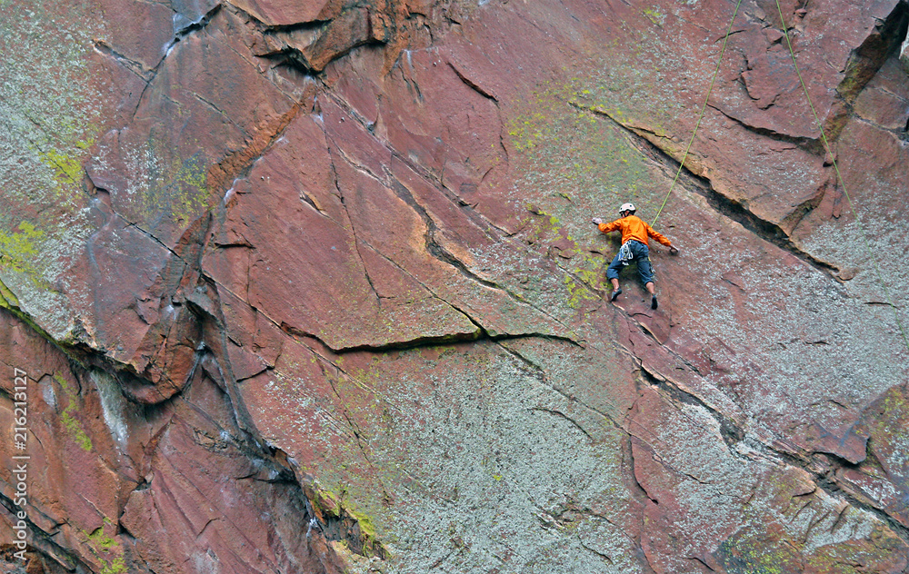 Rock climber heads up a sheeer canyon wall
