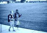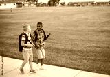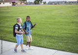 Two diverse school kids walking home together after school and talking together. Back to school photo of diverse school children wearing backpacks in the school yard